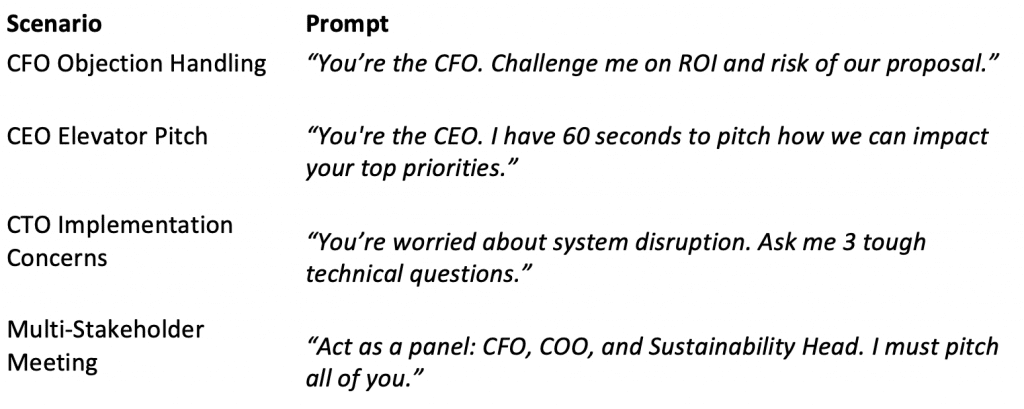 - “What would the CFO care about in this pitch?” — sharpens your value story